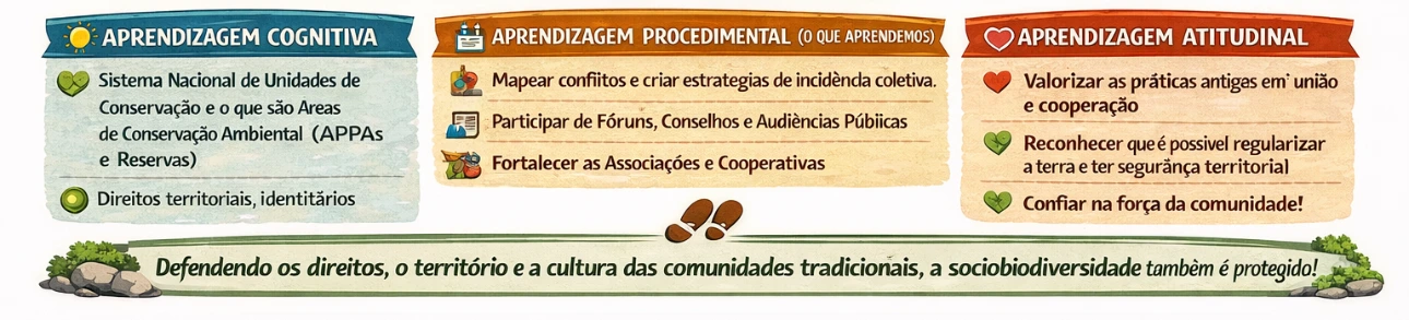 As comunidades tradicionais da APA de Guaraqueçaba acumulam saberes históricos, culturais e territoriais que são fundamentais para a conservação ambiental e para a gestão participativa do território. As atividades formativas desenvolvidas no âmbito do projeto fortaleceram esses saberes, organizando-os em três dimensões complementares de aprendizagem: Cognitiva, Procedimental e Atitudinal. Essas dimensões refletem não apenas o acesso à informação, mas também a capacidade prática de atuação e o fortalecimento de valores coletivos indispensáveis à defesa de direitos, ao uso sustentável do território e à manutenção da sociobiodiversidade.